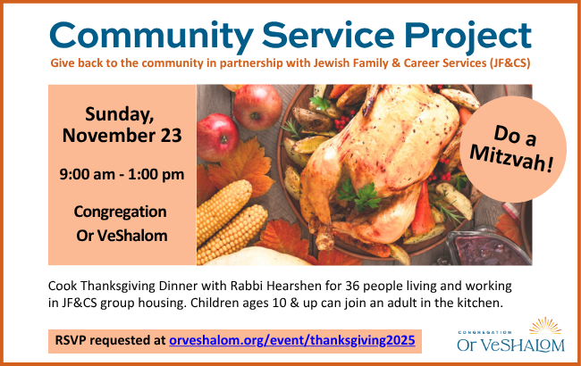 Cook Thanksgiving Dinner with Rabbi Hearshen for 36 people living and working in JF&CS group housing. Children ages 10 & up can join an adult in the kitchen. In partnership with Jewish Family & Career Services (JF&CS). CLICK HERE TO REGISTER.