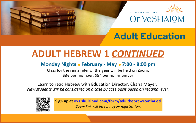 Featured Hebrew for Adults – ContinuedClass for the remainder of the year will be held on Zoom. $36 per member, $54 per non-member Learn to read Hebrew with Education Director, Chana Mayer. New students will be considered on a case by case basis based on reading level. CLICK HERE TO SIGN UP. Zoom link will be sent upon registration.