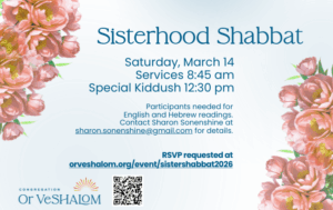 This special service will be led by members of Sisterhood and will be followed by a special Kiddush.